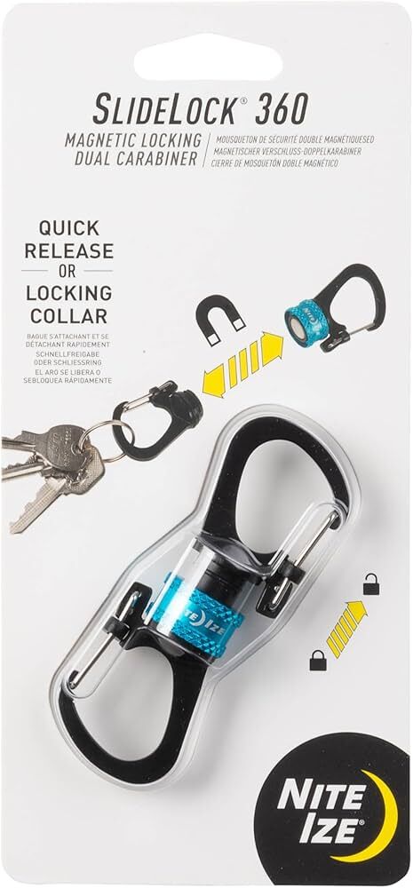 360-degree rotating design for versatile use Slide-to-lock mechanism for added security Durable stainless steel construction Easy one-handed operation Suitable for gear organization and attachment